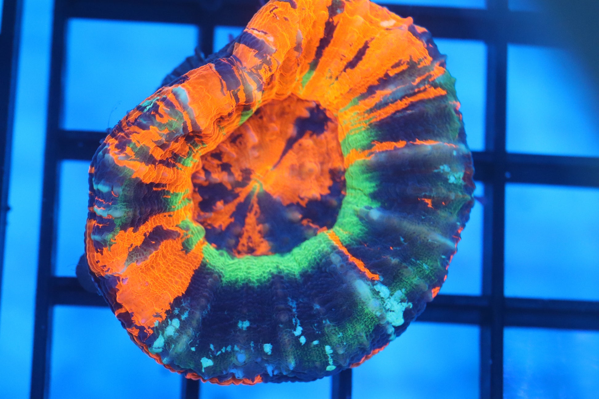AUSSIE MASTER SCOLY is a 1 of 1 RARE piece. It's perfect for any high-end collector who seeks truly unique corals that bring the wow factor into the aquarium. WYSIWYG, fully conditioned. This Double Master is a WYSIWYG item and is ~1 1/2" in diameter.