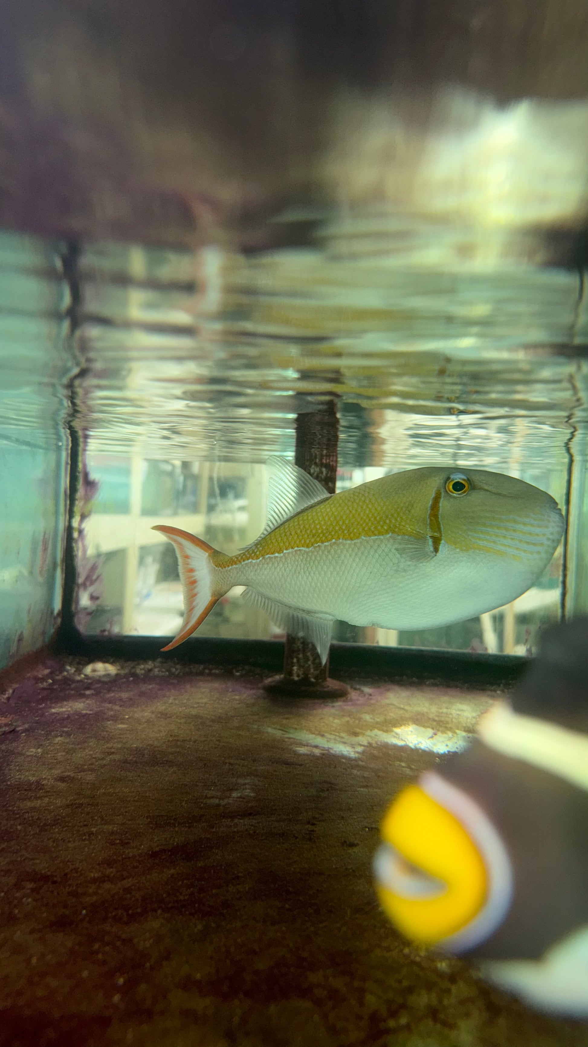 Also known as the blue line trigger, this trigger hales from the very deep waters of Hawaii. It is almost NEVER available. Like its cousin the crosshatch trigger, the goldenback trigger is a planktivore, and therefore reef safe.