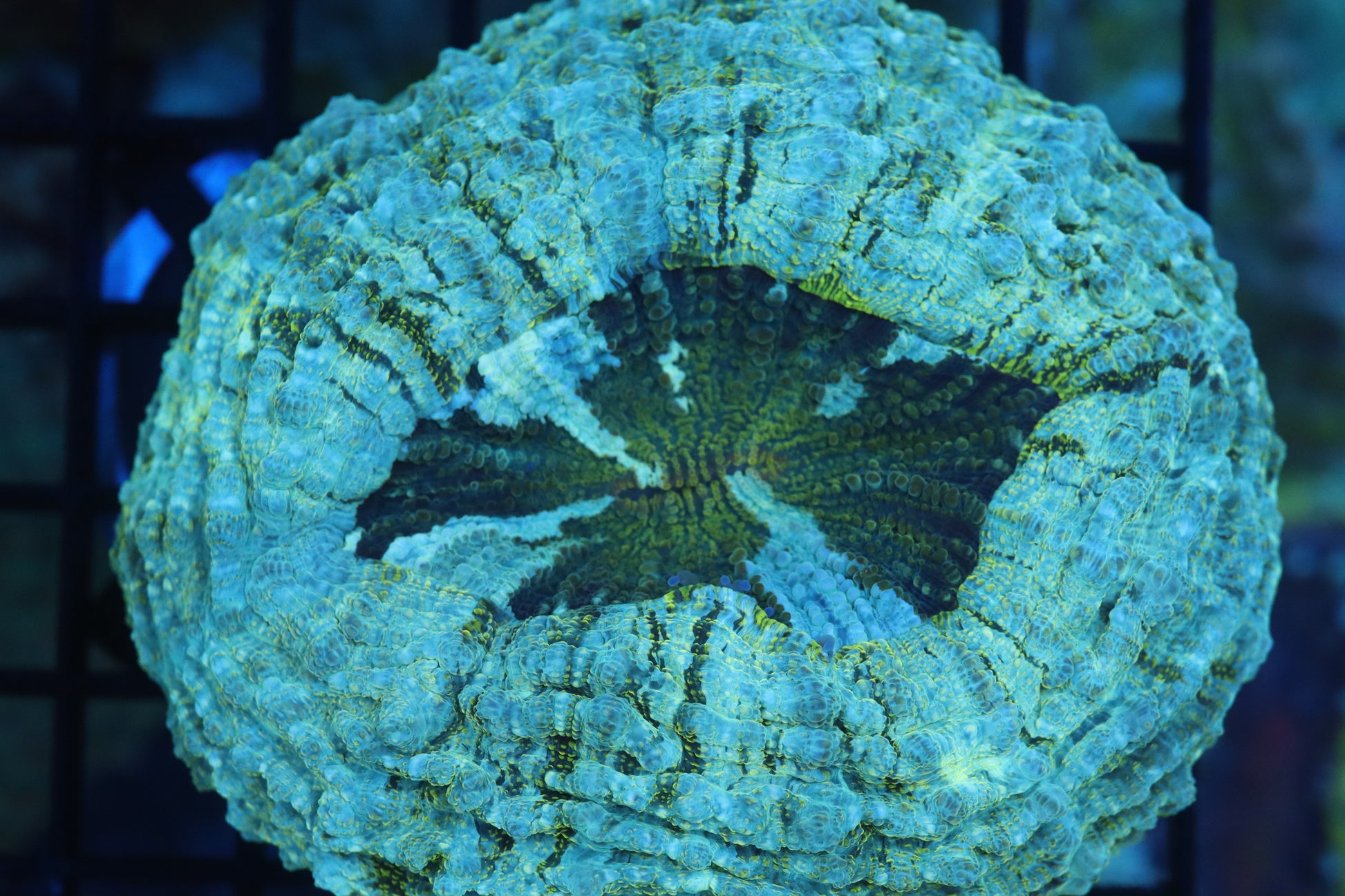 This Acanthophyllia has bright green, gold and hints of blues throughout as seen in the photo. Spectacular for any collector's aquarium. This is a WYSIWYG item. Coral is ~3 1/2" in diameter.