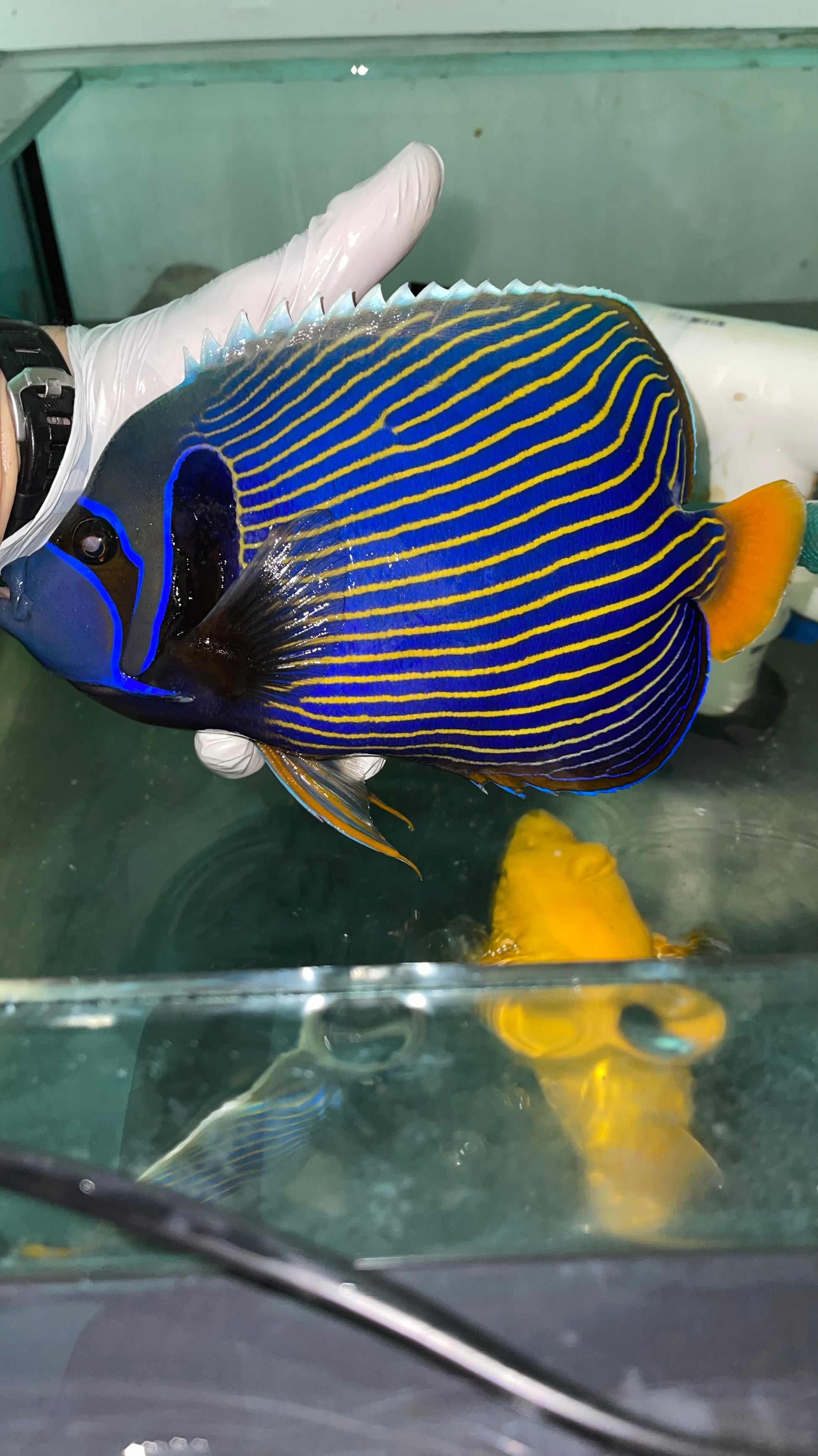 It is also known as the Imperator Angel or the Emperor Angel. It is truly one of the more regal aquarium fish. Found in the Indo-Pacific, this Angel is moderately hardy in the aquarium, though some larger specimens may be difficult to get to eat prepared foods. Juveniles usually take to a varied diet of vegetable and meaty foods. To ensure the Angel retains its vivid colors, you should offer a vitamin supplement with the foods. We recommend either Zoecon or Selcon. Growing to fairly large 15 inches in length, this Angel requires a lot of swimming space. It can be kept with Small-Polyped Stony Corals, but is generally not considered "reef safe". While not shy, it should be provided with caves in which to retreat. The adult coloration with its eye-mask and blue/yellow striping is striking.