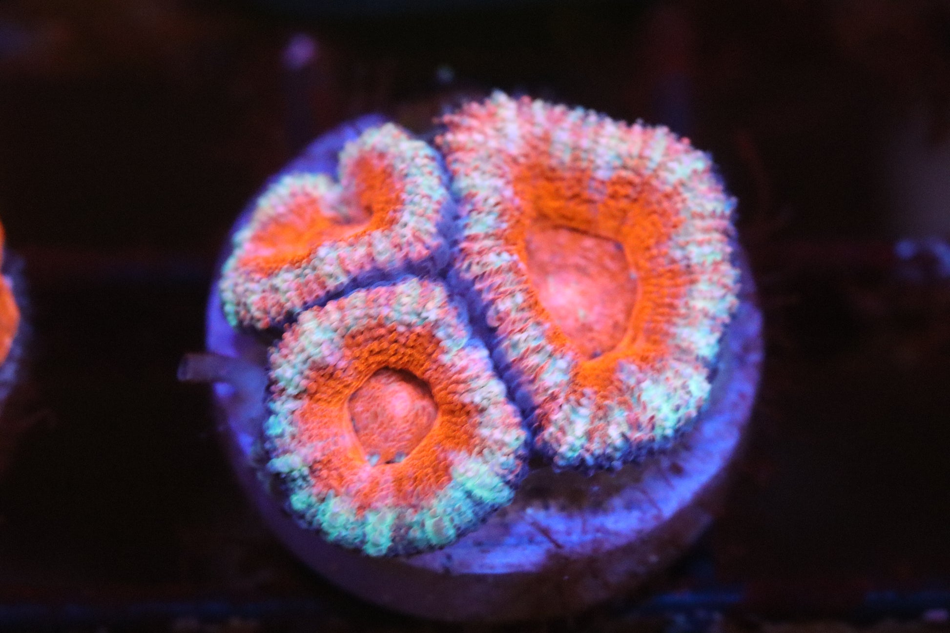 Micromussa Lord Coral, fully conditioned. You will receive a frag like in size and color. Each Egg Crate Square behind it is approximately .5x.5″.