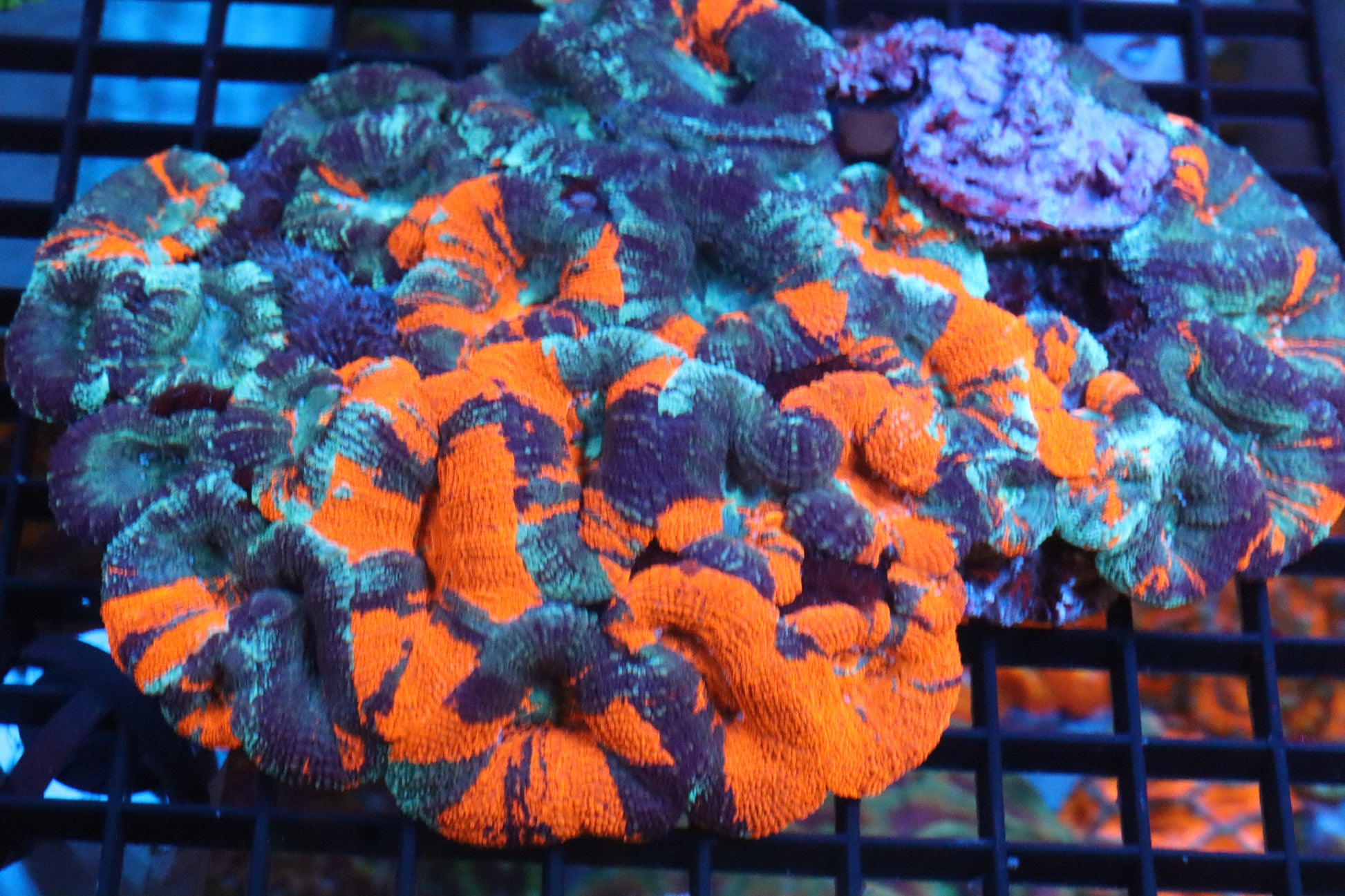 Warpaint Acan Bowerbanki Colony, fully conditioned. Coral is ~6" in diameter. Each Egg Crate Square behind it is approximately .5x.5″.